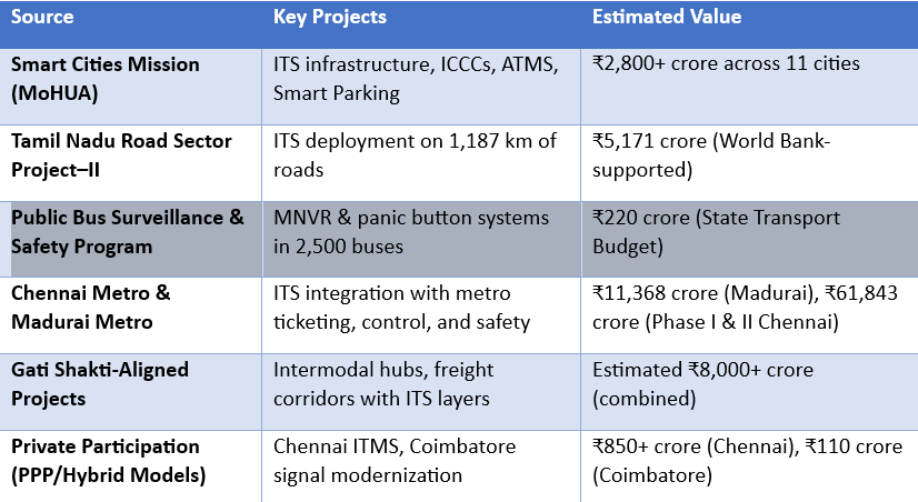 • Central Schemes: Tamil Nadu leverages funds from the Smart Cities Mission, FAME-II, and NUTP for ITS components related to clean mobility, urban transport integration, and enforcement systems.